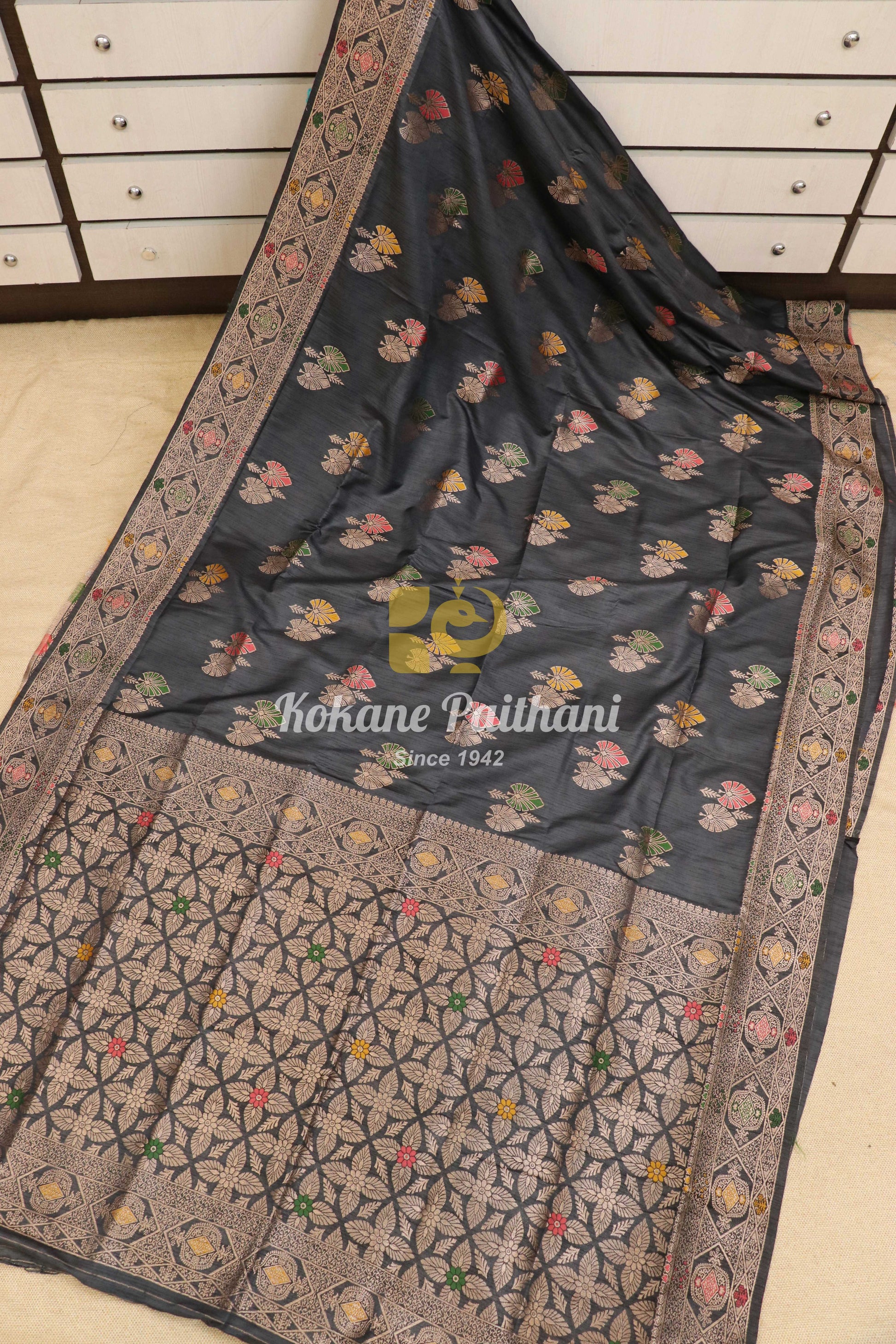 Dark gray color saree with self jari border