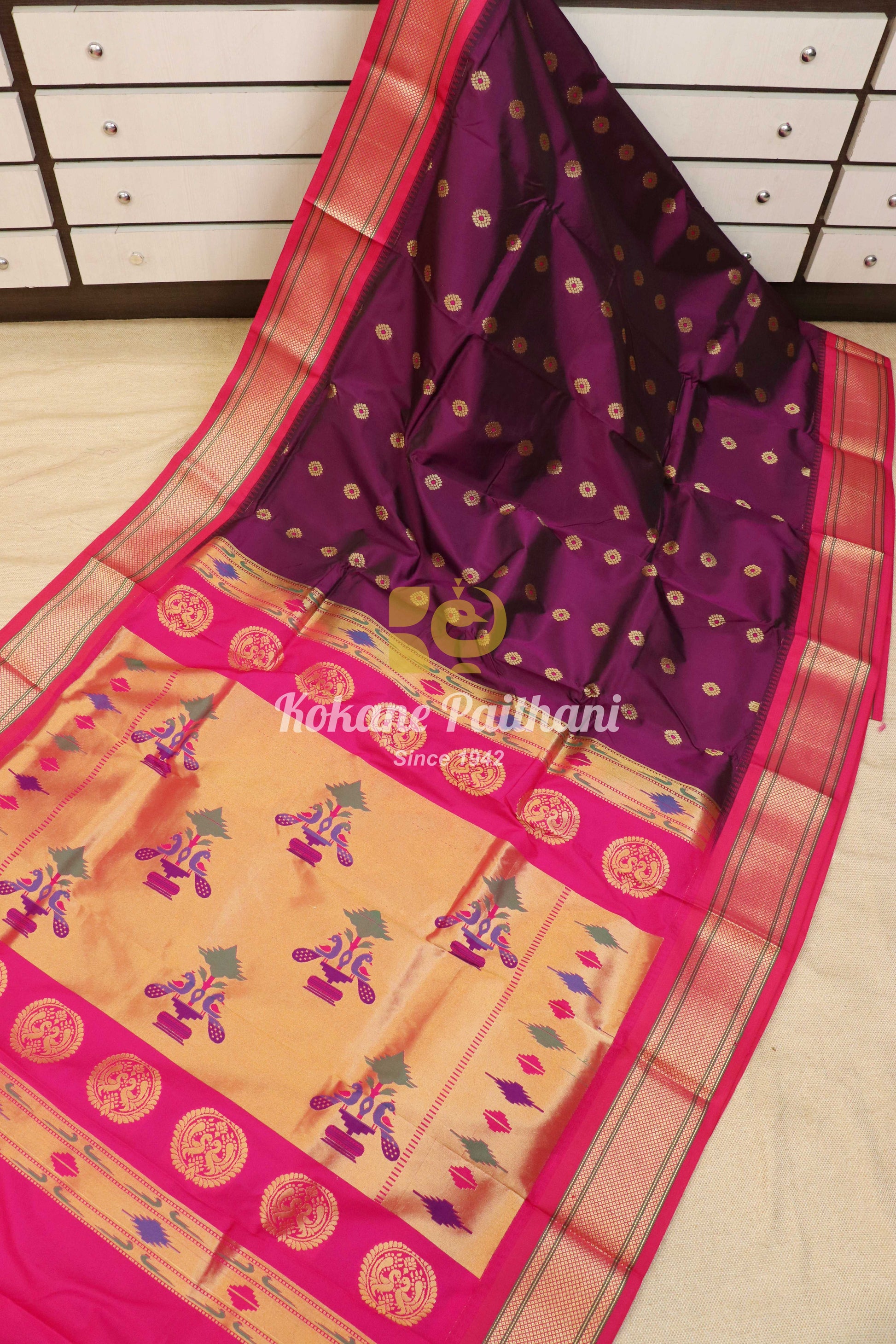 Wine color saree with pink color paithani jari border